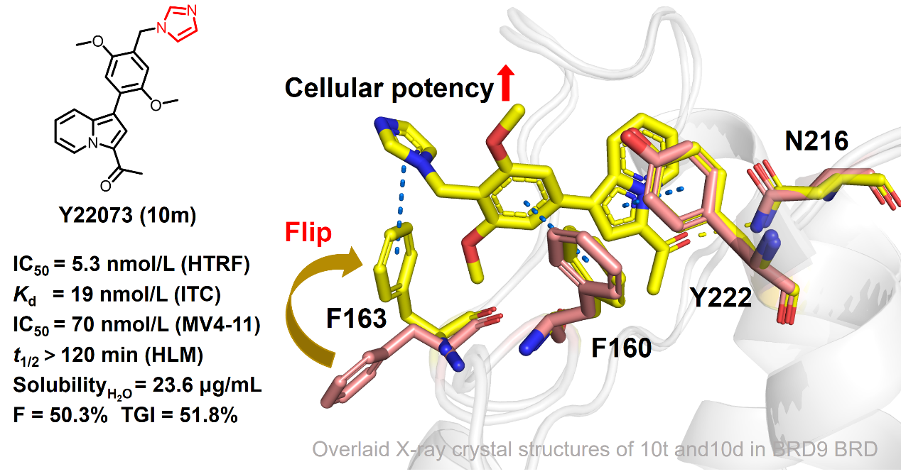 針對溴結(jié)構(gòu)域家族蛋白結(jié)構(gòu)高度相似導(dǎo)致的抑制劑選擇性難題,團(tuán)隊通過優(yōu)勢骨架化合物庫篩選、晶體結(jié)構(gòu)解析以及基于結(jié)構(gòu)的藥物設(shè)計,成功開發(fā)出可用于AML治療的新型BRD9選擇性溴結(jié)構(gòu)域抑制劑Y22073。研究人員從基于結(jié)構(gòu)活性關(guān)系(SAR)的優(yōu)化策略中發(fā)現(xiàn)了咪唑類化合物具有卓越的體外抗增殖活性。合作團(tuán)隊通過X射線晶體結(jié)構(gòu)解析(分辨率最高達(dá)1.78 ?)精準(zhǔn)捕捉到BRD9的ZA通道存在一個獨特的“可調(diào)控開關(guān)”——Phe163翻轉(zhuǎn)開關(guān)。抑制劑中關(guān)鍵的咪唑藥效基團(tuán)能夠誘導(dǎo)BRD9蛋白的Phe163殘基翻轉(zhuǎn)并與其形成穩(wěn)定的π-π相互作用。然而,其他溴結(jié)構(gòu)域(如BRD7、BRD4、CECR2)中對應(yīng)位置的殘基無法與咪唑基形成有效相互作用,直接證明了該機制的特異性。這一分子層面的突破性發(fā)現(xiàn)不僅顯著提升了化合物的體外活性,也使得Y22073成為首個在AML模型中展現(xiàn)明確疾病表型干預(yù)能力的BRD9抑制劑。研究團(tuán)隊還創(chuàng)新性地采用該修飾策略對現(xiàn)有BRD9抑制劑進(jìn)行結(jié)構(gòu)改造,結(jié)果表明,經(jīng)此策略修飾后的化合物在體外的活性顯著提升,進(jìn)一步證實咪唑基團(tuán)可通過調(diào)控獨特的Phe163開關(guān),在提高活性方面發(fā)揮關(guān)鍵作用。Y22073表現(xiàn)出良好的溴結(jié)構(gòu)域選擇性、代謝穩(wěn)定性、溶解性并兼具理想的藥代動力學(xué)特性,在MV4-11異種移植小鼠模型中表現(xiàn)出顯著的口服抗腫瘤效果,且無明顯毒性。綜合其優(yōu)異的體外活性、體內(nèi)療效及成藥性特征,Y22073作為具有First-in-Class潛力的BRD9溴結(jié)構(gòu)域選擇性抑制劑,為急性髓系白血病的靶向治療提供了極具臨床轉(zhuǎn)化價值的新型候選藥物。