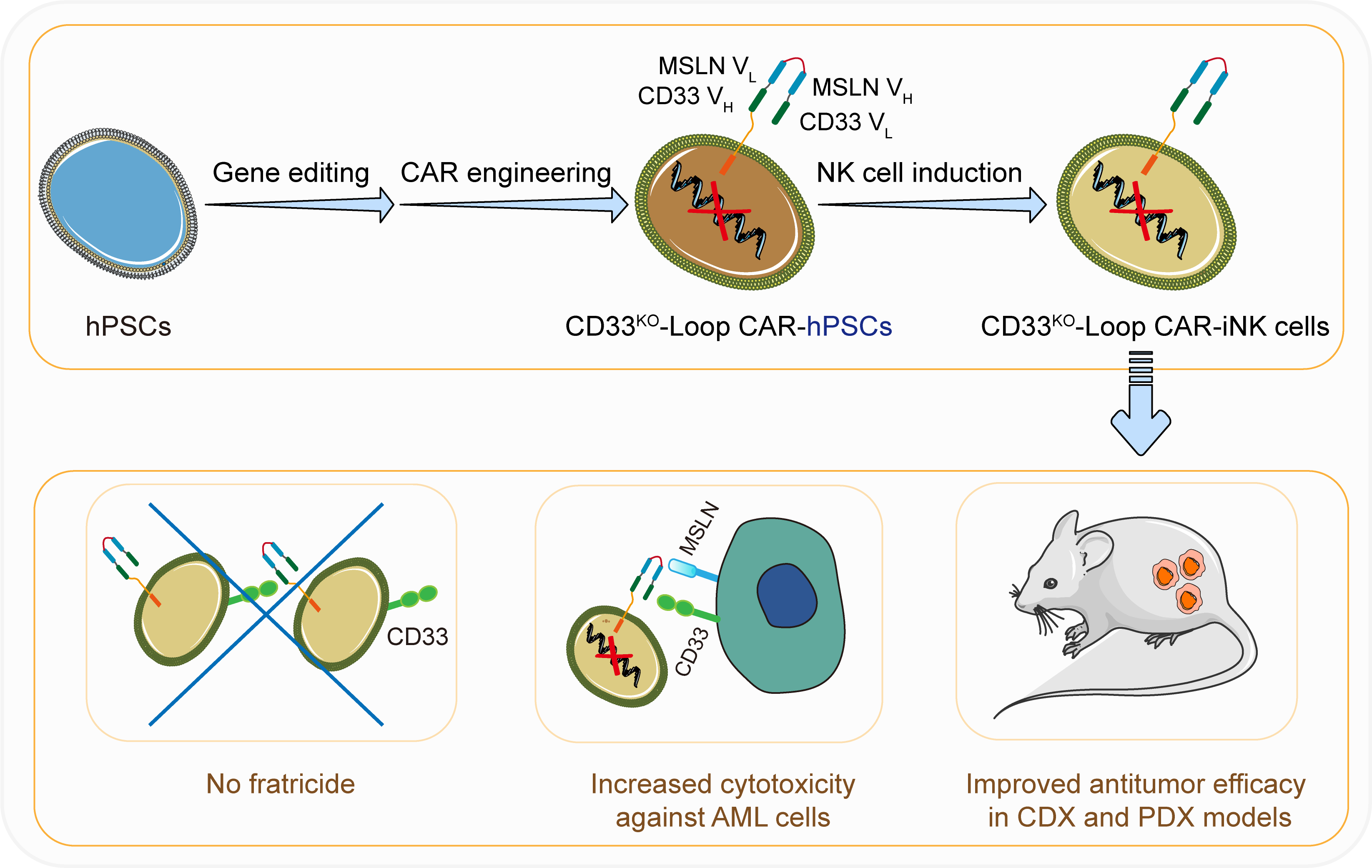 近日,中國科學(xué)院廣州生物醫(yī)藥與健康研究院(以下簡稱“廣州健康院”)血液譜系再生研究組在Journal for ImmunoTherapy of Cancer雜志在線發(fā)表了題為“CD33KO-CD33-mesothelin loop CAR design avoids fratricide and improves efficacy of iNK cells against acute myeloid leukemia”的研究論文。該研究針對(duì)間皮素(MSLN)和CD33靶點(diǎn)雙陽性的急性髓系白血?。ˋML)設(shè)計(jì)了環(huán)形雙靶點(diǎn)嵌合抗原受體(CD33-MSLN Loop CAR,Loop CAR),并基于臍帶血NK細(xì)胞(UCB-NK)或人多能干細(xì)胞(hPSCs)誘導(dǎo)的NK(iNK)細(xì)胞制備出Loop?CAR-NK或Loop?CAR-iNK細(xì)胞。Loop?CAR-NK細(xì)胞能夠有效殺傷AML細(xì)胞。研究還進(jìn)一步通過在hPSCs中敲除CD33基因解決了Loop?CAR-iNK細(xì)胞因靶向自身CD33抗原分子而引起的“自相殘殺”問題。該研究為AML細(xì)胞治療新策略提供理論和技術(shù)依據(jù)。